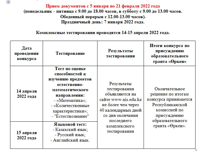 Автономная организация образования «Назарбаев Интеллектуальные школы» с целью формирования ученического контингента на 2022-2023 учебный год объявляет сроки проведения конкурсного отбора претендентов для присуждения образовательного гранта Первого Президента […]