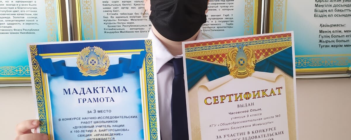 Өскелең ұрпақты отандық тарихқа бағыттау және жастардың азаматтық бірегейлігін нығайту шеңберінде, «Ұлттың рухани ұстазы А. Байтұрсыновтың 150 жылдығы» атауымен өткен жалпы білім беретін мектептердің оқушылары арасындағы Қазақстан тарихынан ғылыми-зерттеушілік жұмыстардың облыстық байқауында 8Б сыныбының кадеті Ниёзов Акбаршах және 9 В сынып білім алушысы Часовская Ольга сәйкесінше «Қазақстан тарихы» және «Өлкетану» номинацияларында 3 орын алды. Кадет А. Ниезовтың ғылыми жұмысы әскери өнерді зерттеу көзі ретінде аты аңызға айналған әскери стратег Бауыржан Момышұлының әскери естеліктеріне арналды. О.Часовскаяның ғылыми ізденістері Қостанай облысындағы білім беру жүйесін дамыту проблемасына шоғырланды. А. Байтұрсынов атындағы Қостанай өңірлік университетінің әлеуметтік-гуманитарлық пәндердің кафедрасы тұлғасындағы байқаудың ұйымдастырушылары, қазылар алқасы, құрамында аймақтың жетекші тарихшы-зерттеушілері т. ғ. д., профессор А. А. Айтмухамбетов, т. ғ. д., профессор Д. М. Легкий, тарих ғылымдарының кандидаты С. С. Исмаилов, PhD докторы Е. Е. Ибраев қатысушылар мен жүлдегерлерді, сондай-ақ тарих және құқық негіздері мұғалімі, білім алушылардың ғылыми жетекшісі Б.К. Дулатов сертификаттармен және грамоталармен марапаттады.